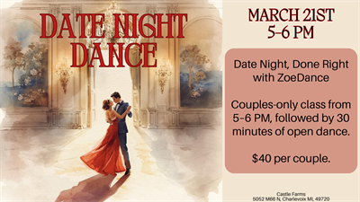 Join us March 21 from 5–6 PM for a fun and relaxed Date Night Dance Class with ZoeDance, followed by 30 minutes of open dance time to practice your new moves.