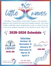Petoskey District Library and Charlevoix Public Library are hosting "Little Waves," a young children's music program. Free and open to the public and sponsored by the Great Lakes Chamber Orchestra (GLCO), the program is designed to introduce young children (ages 4 - 10) and their families to music in an entertaining setting. Each drop-in event takes place at 10:30 am in Petoskey and 1 pm in Charlevoix. Each session features a multimedia story, an opportunity to hear one or more GLCO musicians demonstrate and explain how their instruments work, and fun music-related activities for kids. Don't miss the fun! For more information, contact the library, GLCO 231-487-0010, or visit www.glcorchestra.org/education/little-waves/.